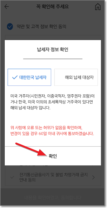 그럼 아래와 같은 내용들이 나오는데, 약관 앞에 있는 브이 체크를 하시고, 뜨는 창에 대한민국 납세자인지 해외 납세자인지 체크하고 "확인"을 누릅니다.