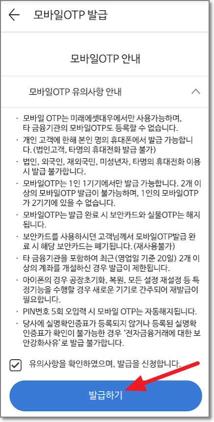 다음처럼 나오는데요."모바일 OTP유의사항 안내"를 누르고 "유의사항을 확인하였으며, 발급을 신청합니다"를 체크하고 "발급하기"를 누릅니다.