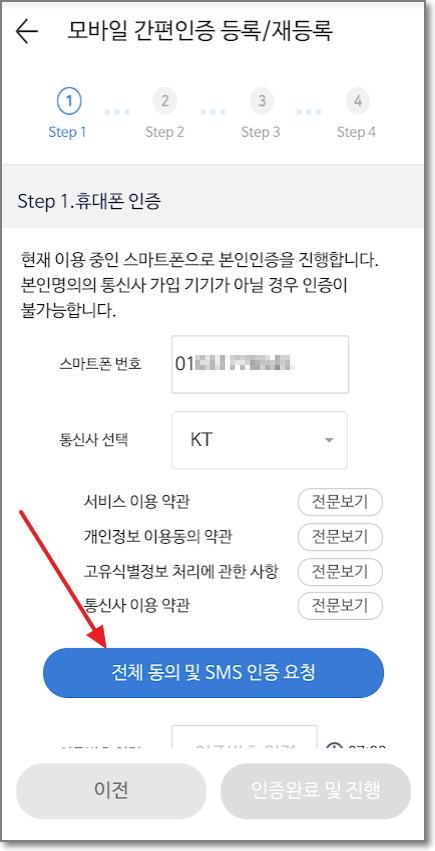 모두 입력하고 동의했으면, 인증 요청을 누릅니다.