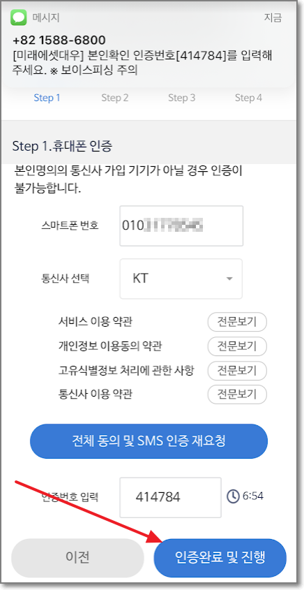 문자로 온 인증번호를 인증번호란에 입력하고 "다음"을 누릅니다.