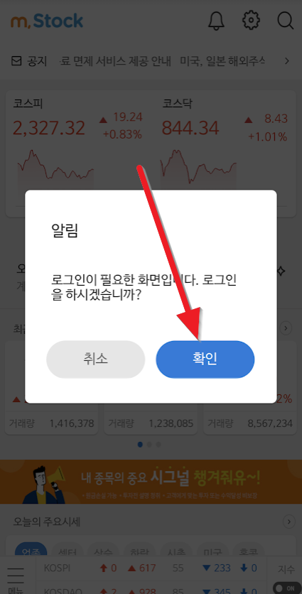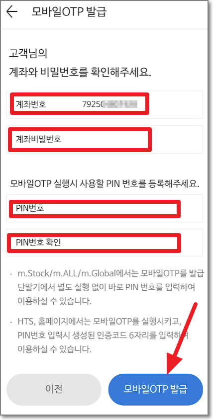 계좌 개설 이후에 m.Stock (이 앱이랑 다른 앱입니다), 또는 m.ALL(이 앱입니다.)의 모바일 OTP 발급 화면에서 모바일 OTP를 발급받으라고 합니다. "확인"을 누릅니다.
