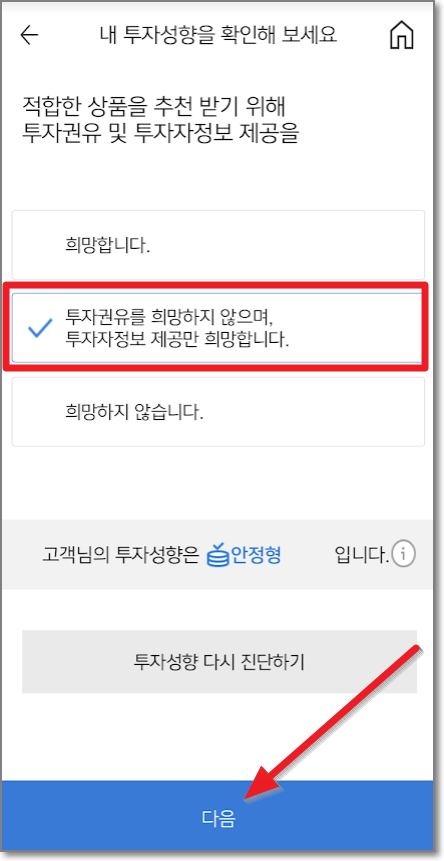 이제 투자성향 확인이 나오는데요. 여기서 "투자권유를 희망하지 않으며, 투자자 정보 제공만 희망합니다"를 체크하고 "다음"을 누릅니다.