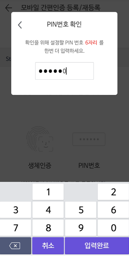 아래처럼 PIN번호를 두 번 입력합니다. (6자리로 만들어야 하고요. 절대로 잊으면 안 됩니다.)