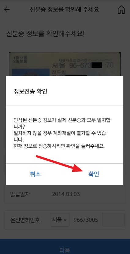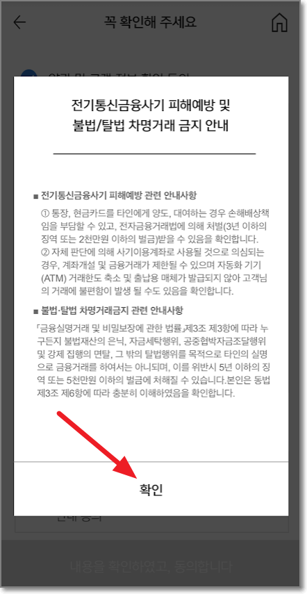 전기통신 금융사기 피해예방 및 불법/탈법 차명거래 금지 안내도 "확인"을 누르고, 다음 화면에서 "내용을 확인하였고, 동의합니다"를 누릅니다.