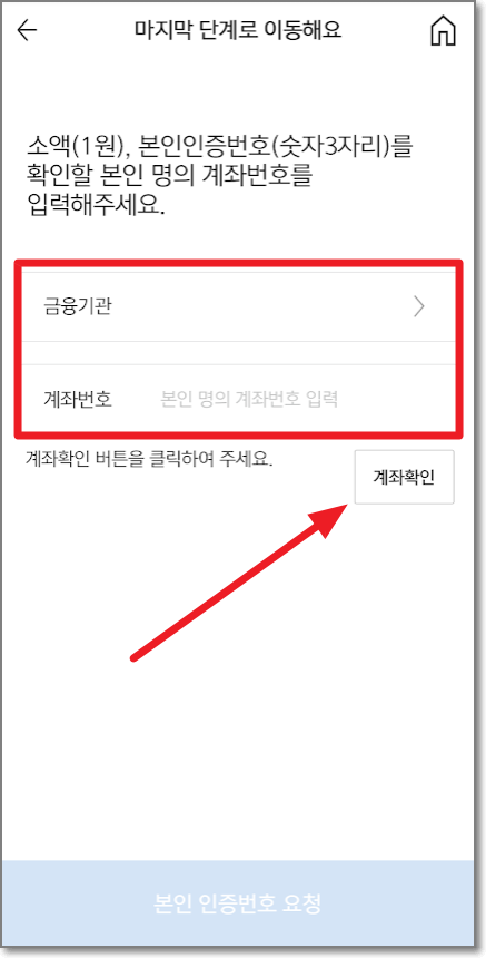 은행 또는 증권 사명과 계좌번호를 입력하고 "계좌 확인"버튼을 누릅니다.
