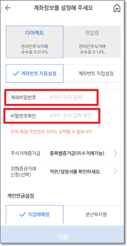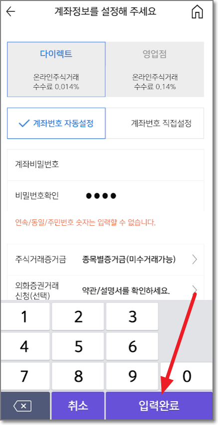 계좌는 디렉트로 수수료가 0.014%인 것(주식 매매수수료)으로 만들어졌으며 계좌번호는 자동 설정이 되는 것입니다. 계좌 비밀번호 4자리 숫자를 두 번 입력하고 입력완료를 누릅니다.