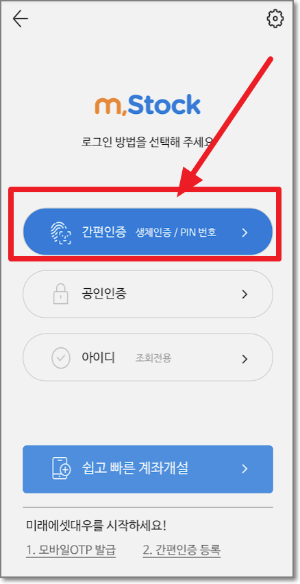 다시 m.Stock 첫 화면으로 가서 톱니를 누르고 로그인 방법을 "간편 인증"으로 선택하고 누릅니다.