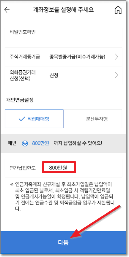 개인연금 설정을 하는데요. 매년 800만 원까지 납입할 수 있다고 하는데요. 연간 납입한도를 800만 원으로 적어놓으시면 됩니다. 이 연금저축은 입금을 해야만 처리가 일어나므로 원할 때 입금을 시작하시면 되는 계좌입니다. 이제 다음을 누릅니다.