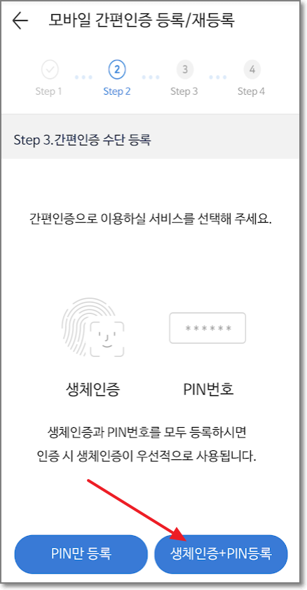 그럼 문자가 오고 인증번호 입력 후에 "인증 완료 및 진행"을 누르면 나오는 화면에서 "생체인증+PIN등록"을 누릅니다.