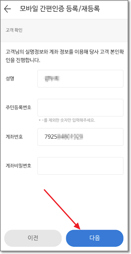성명, 주민번호, 계좌번호(주식계좌번호), 비밀번호를 쓰고 "다음"을 눌러서 모바일 간편 인증을 전체 동의 및 SMS 인증 요청을 누릅니다.