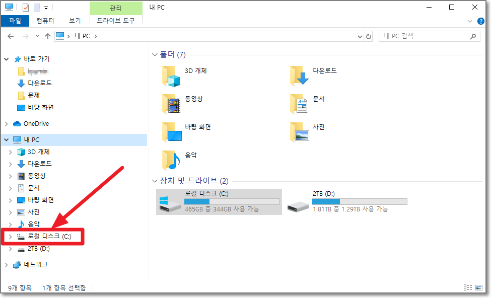 탐색기가 열리면, 왼쪽에서 "로컬디스크(C:)"를 누릅니다. 이름은 다를 수 있지만 C를 찾으면 대부분 맞습니다.
