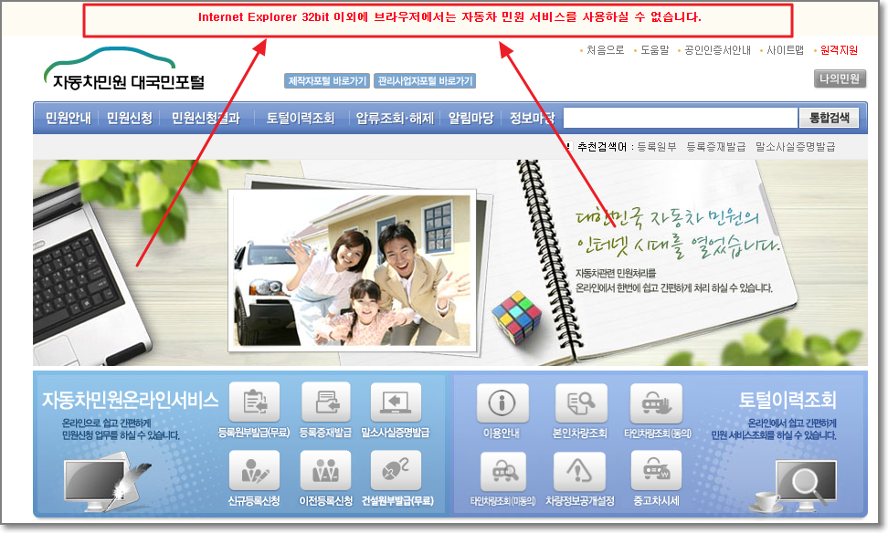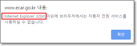 확인을 누르면 아래처럼 화면 맨위에 "Internet Explorer 32bit 이외의 브라우저에서는 자동차 민원 서비스를 사용하실 수 없습니다." 라고 써있습니다.