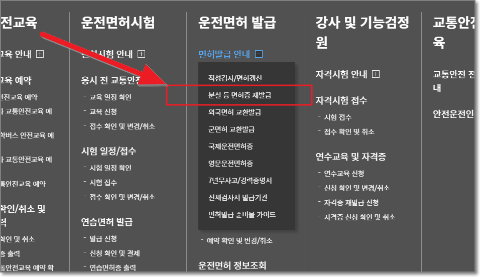 하위메뉴가 나오면 "분실 등 면허증 재발급"을 클릭합니다.
