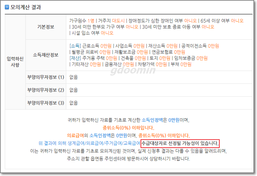 이상으로 기초생활수급자 조건과 모의계산해보는 법 그리고 신청하는 방법에 대해서 알아보았습니다. 위에 링크한 곳에서 모의계산을 해보시고 기준에 맞는지 확인해보신 후에 소득인정액에 부합하는 서비스를 받으시길 바랍니다.