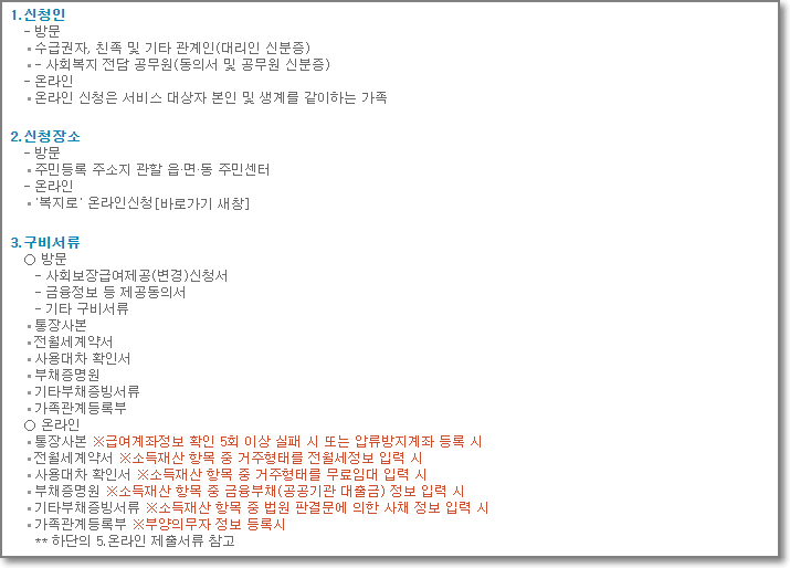 생계, 의료, 주거, 교육급여 중에서 주거급여와 교육급여는 온라인 신청이 가능하지만, 생계급여와 의료급여는 반드시 주민센터에 방문을 해서 상담 후에 서비스 신청을 해야 합니다.