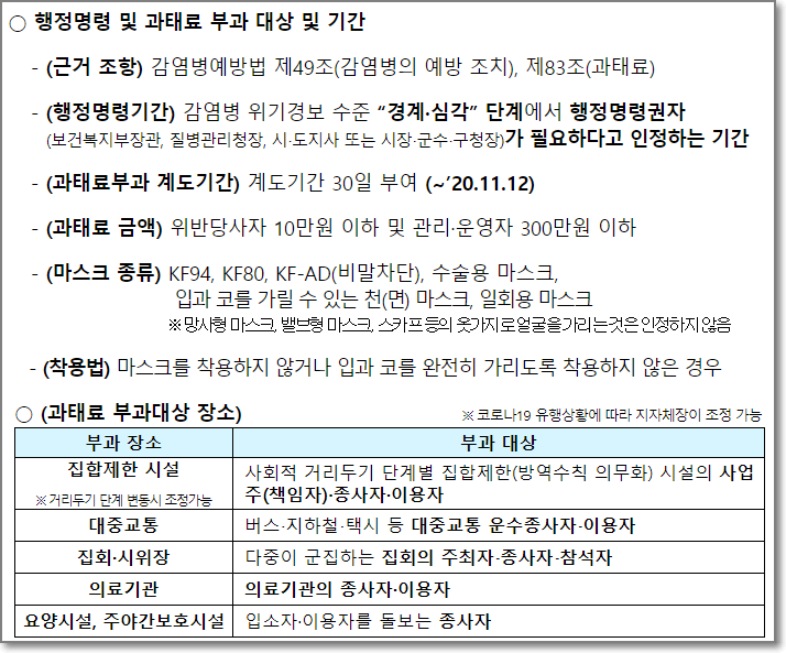 당장 11월13일부터 버스나 지하철 같은 대중교통과 여러명이 사용하는 다중이용시얼 등에서 '마스크 착용 의무화 행정명령"을 위반하면 최고 10만원의 과태료가 부과가 됩니다.