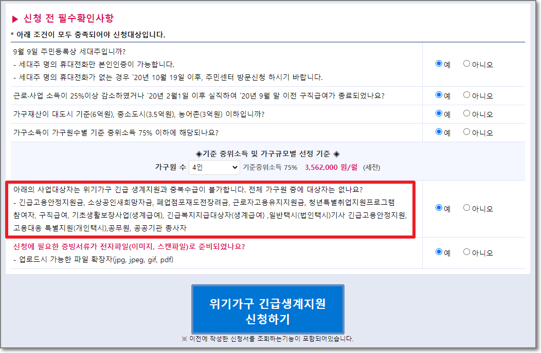 아래처럼 "긴급고용안정지원금, 소상공인새희망자금, 폐업점포재도전장려금, 근로자고용유지지원금, 청년특별취업지원프로그램 참여자, 구직급여, 기초생활보장사업(생계급여), 긴급복지지급대상자(생계급여) ,일반택시(법인택시)기사 긴급고용안정지원, 고용대응 특별지원(개인택시),공무원, 공공기관 종사자"가 전체 가구원중에 대상자가 없어야 합니다.