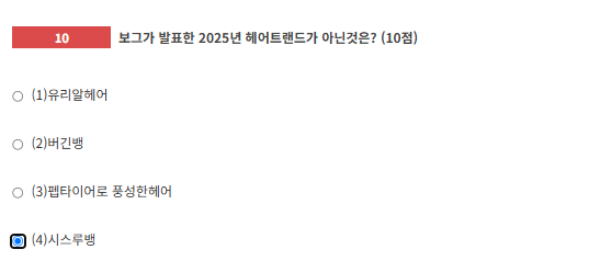 👉 보그가 발표한 2025년 헤어트랜드가 아닌 것은? (10점)