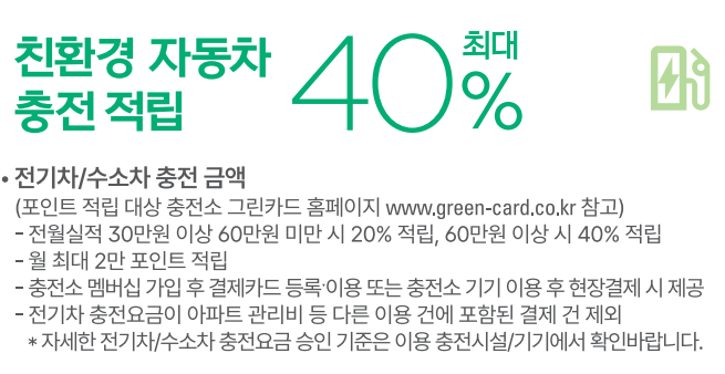 - 전기차 및 수소차 충전 혜택: 전기차나 수소차 충전 시, 30만원 이상 충전할 경우 20%, 60만원 이상 충전할 경우 40%를 에코머니로 적립받을 수 있습니다. 이 또한 최대 2만원까지 가능합니다.