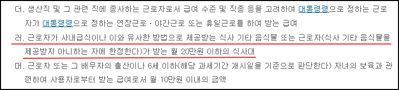 | 식사 또는 식사대 | 근로자가 사내급식 또는 이와 유사한 방법으로 제공받는 식사 기타 음식물 식사 기타 음식물을 제공받지 아니하는 근로자가 받는 월 20만원 이하의 식사대 |