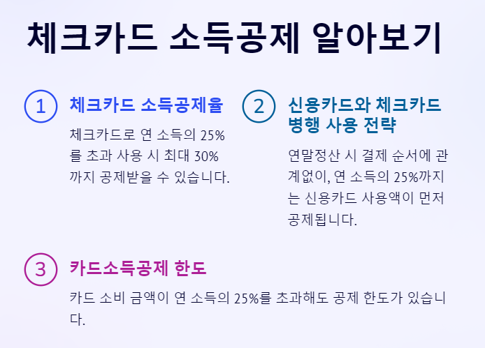연말정산 시 결제 순서에 관계없이, 연 소득의 25%까지는 신용카드 사용액이 먼저 공제됩니다. 이후 25%를 초과하는 금액은 체크카드, 선불카드, 지역화폐, 현금영수증으로 처리하면 더 많은 소득공제를 받을 수 있습니다.