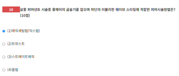 👉 헤어디자인의 3대 요소 중 아닌 것은? (10점)