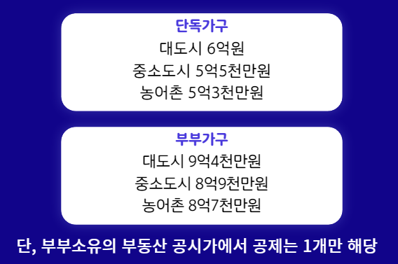 다음 부부가구 역시 기초연금 51만 7,080원을 모두 받으려면 대도시 기준 시가표준액이 9억 4천만원 중소도시는 8억 9천만원 농어촌은 8억 7천만원 이하여야 합니다 .그리고 여기서 주의하셔야 할 점은 소유하고 계신 부동산은 시가표준액 즉 공시가를 기준으로 계산되며 지역별 기본공제는 부부가 소유하고 있는 부동산의 시가표준액을 모두 합한 후 딱 한 번만 공제 받으실 수 있습니다.
