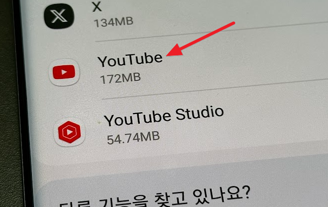 3. YouTube 앱 항목이 나올 때까지 화면을 내려서 유튜브 항목을 누릅니다.
