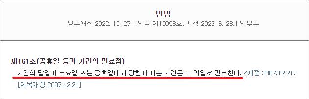 하지만 여기까지 알면 아직 해소가 되지 않는 것이 남게 됩니다. 바로 공휴일입니다. 그래서 민법 161조에서는 이러한 분쟁을 미리 방지하기 위해서 공휴일에 대한 내용도 쓰여있습니다.