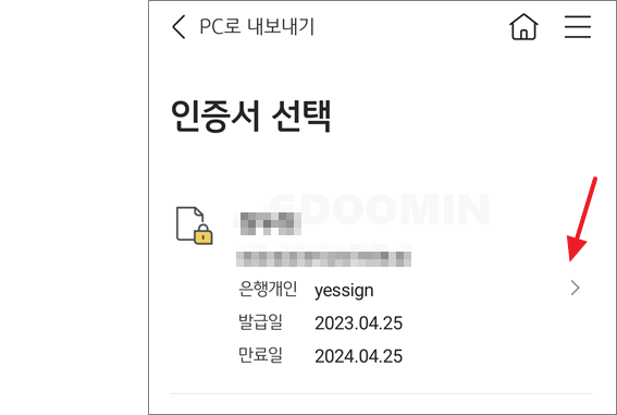 인증서 내보내기 화면에서 PC로 내보내기를 선택하고 인증서가 나오면 그 인증서를 누릅니다.