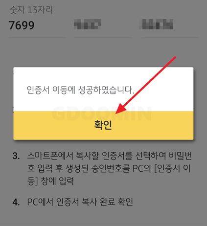 이제 끝났습니다. 공동인증서가 스마트폰에서 PC로 정상적으로 복사되었습니다.