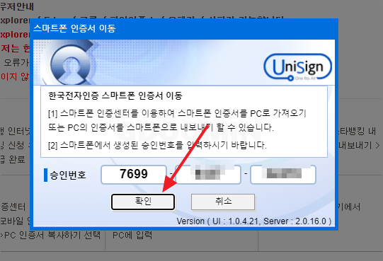 위 화면처럼 UniSign의 스마트폰 인증서 이동 창이 나오고 승인번호를 입력하라고 합니다.
