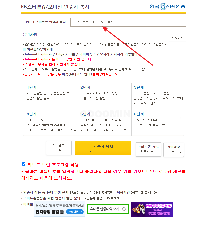 KB스타뱅킹/모바일 인증서 복사에 탭이 2개가 있는데요. PC에서 스마트폰으로 복사가 아니고, '스마트폰에서 PC로 인증서 복사'를 선택해야 합니다.