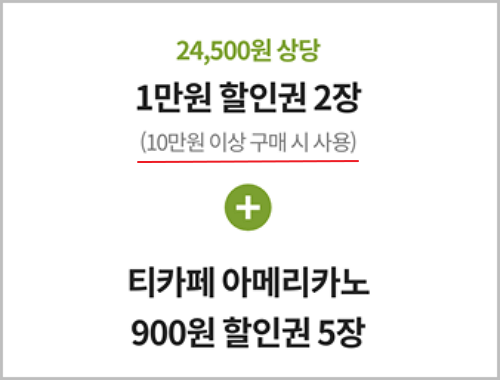 우선 이마트 트레이더스에서 10만원 이상 구매시 사용할 수 있는 1만원 할인권을 2장 주며, 이마트 트레이더스의 푸드코트인 T카페에서 판매하는 아메리카노(1000원)을 100원에 마실 수 있도록 900원 할인을 해주는 쿠폰을 5장 지급해서 총 24500원 상당의 혜택을 준다고 합니다.