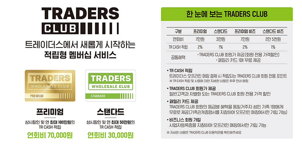 트레이더스 클럽 멤버십은 스탠다드와 프리미엄 등급으로 나뉘고, 사업자 고객을 위한 스탠다드 비즈와 프리미엄 비즈 등급도 생깁니다. 코스트코의 골드스타와 이그제큐티브 멤버십 그리고 비즈니스와 비즈니스 이그제큐티브를 연상하게 합니다.