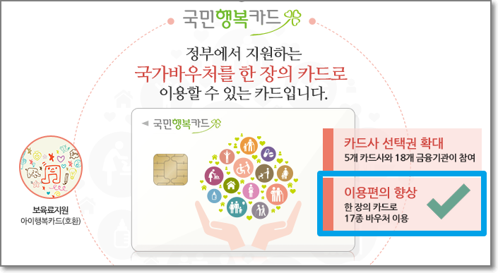 국민행복카드는 정부에서 지원하는 국가 바우처를 한 장의 카드로 이용할 수 있게 만들어 놓은 카드인데요. 대한민국 국민이라면 누구나 발급이 가능하고, 국민행복카드는 5개 카드사와 18개의 금융기관이 참여하며 한 장의 카드로 17종의 바우처를 이용할 수 있습니다. 바우처(voucher)라는 단어 자체가 현금을 지급해주는 보조금과 구별되는데요. 바우처는 '현물' 또는 '특정 현물로만 교환이 가능한 상품권'을 지급하는 방식입니다.