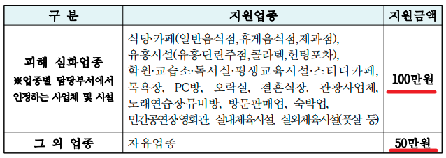 지원업종 및 지원금액