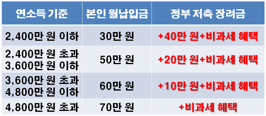 ▶ 연소득 2,400만 원 이하는 본인 월납입 30만 원 + 저축 장려금 40만 원+비과세 혜택