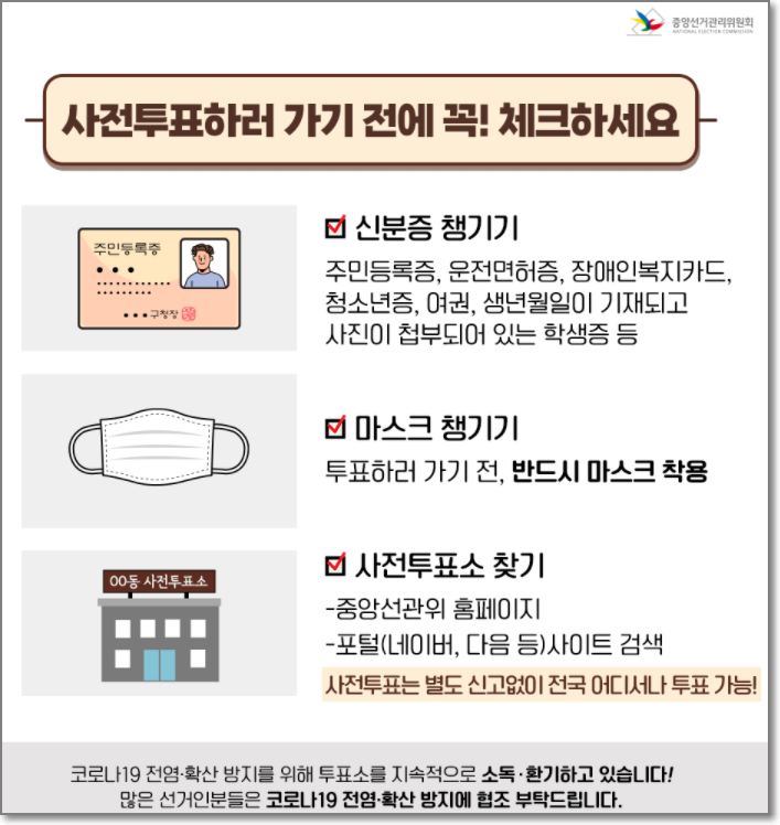 사전투표소에 가기전에 본인을 확인할 신분증(주민등록증, 운전면허증, 여권, 장애인복지카드, 청소년증외에도 생년월일이 기재되고 사진이 붙어있는 학생증)과 마스크를 꼭 챙기고(마스크 없으면 투표 못해요) 인근 사전투표소 위치를 확인해야 합니다.