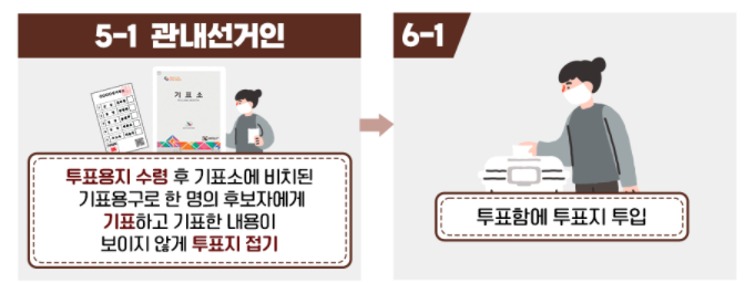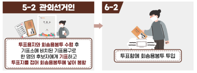 투표용지와 회송용봉투 수령 후 기표소에 비치된 기표용구로 한 명의 후보자에게 기표하고 투표지를 접어 회송용봉투에 넣어 봉함