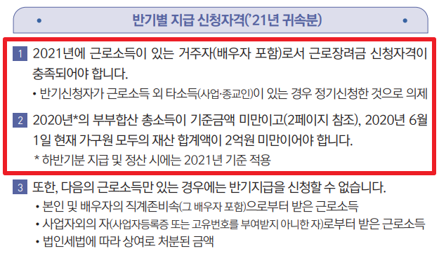 반기 신청을 하는 근로장려금은 2021년에 근로소득만 있는 본인 및 배우자만 신청이 가능하며 근로소득 외에 다른 소득이 있는 경우 반기 신청 대상자가 아닙니다. 만약 근로소득 외의 소득이 있는 경우 반기 신청을 하면 정기신청한 것으로 봐서 9월에 정산을 합니다.