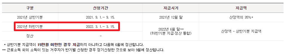 2021년 하반기분을 신청하는 근로장려금 반기 신청 기간은 2022년 3월 1일부터 3월 15일까지입니다.