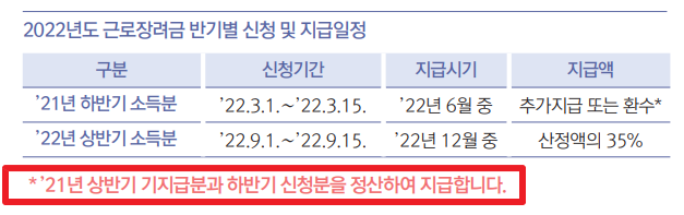 근로장려금 반기별 신청기한이 지난 후 3개월 이내에 결정하여 15일 이내에 환급하며 하반기분은 2022년 6월 말에 지급됩니다. 장려금 산정액의 35%를 반기별로 지급하고 다음 연도 5월에 정기 신청했을 경우의 지급액과 비교하여 정산하고 하반기분 신청자는 상반기와 하반기의 총급여를 합산하여 근로장려금 지급액을 산정합니다.