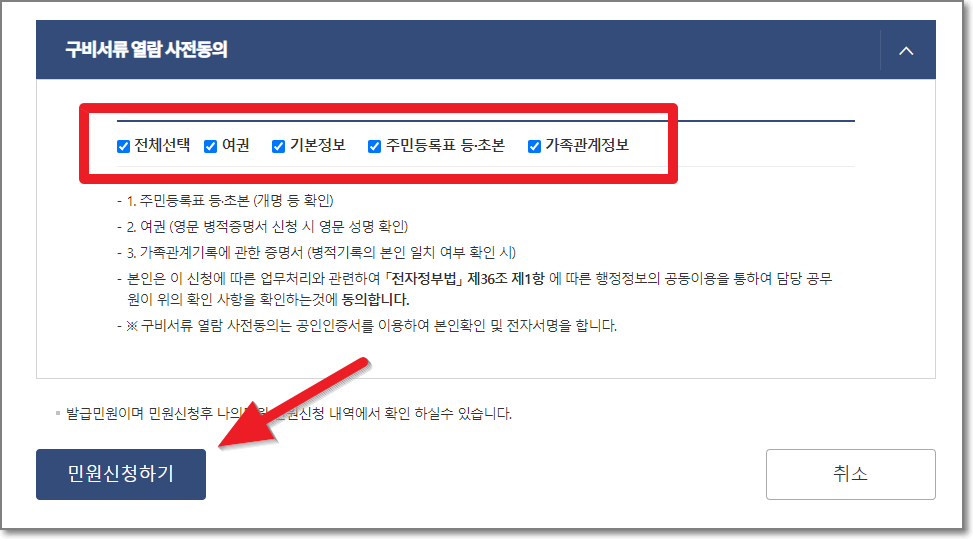 5. 구비서류 열람 사전동의 및 민원 신청하기