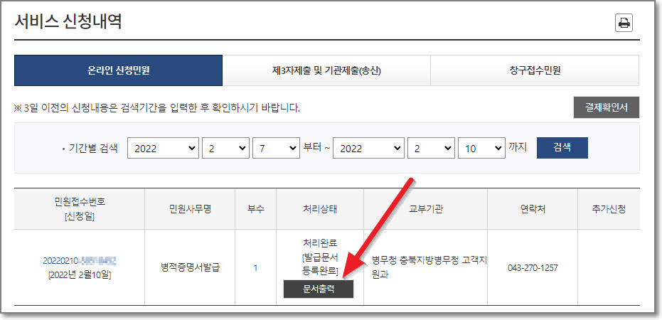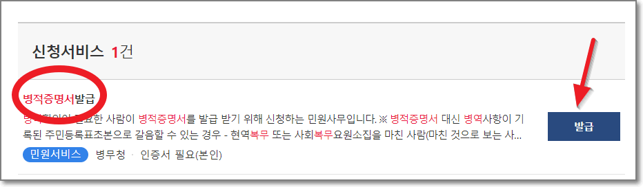 검색결과 최상단에 나온 "병적증명서발급"의 오른쪽 "발급"버튼을 누릅니다.