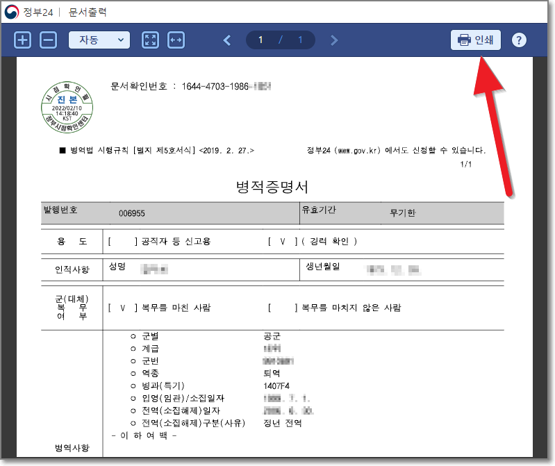병적증명서 미리보기가 나오면 우측 상단에 있는 "인쇄"를 누릅니다.