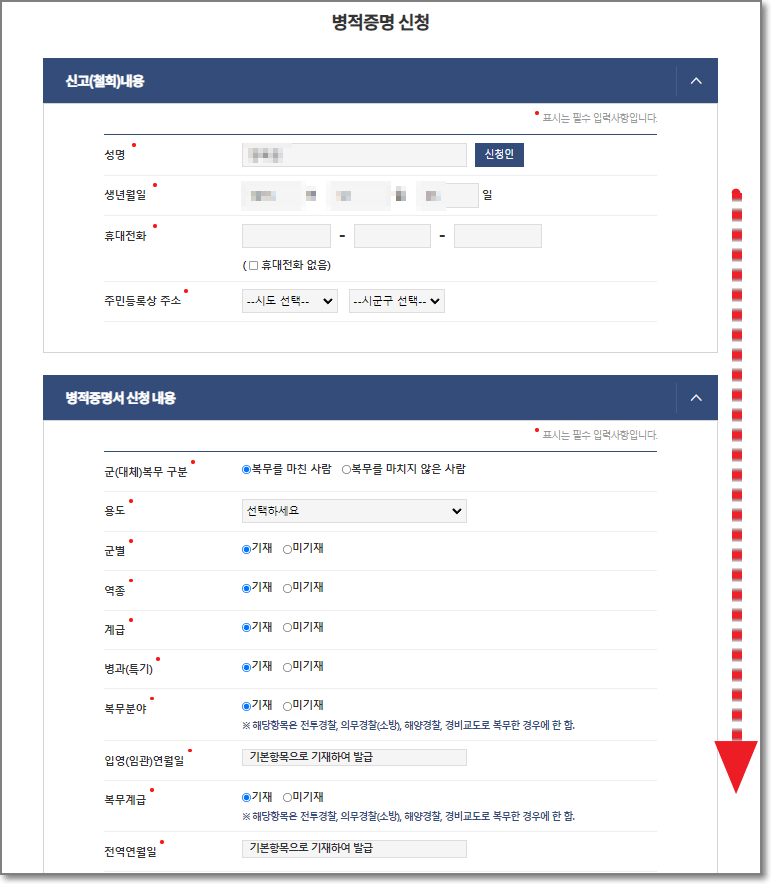 성명과 생년월일, 휴대전화, 주소를 입력하고 병적증명서에 신청할 내용을 모두 "기재"로 체크하고 스크롤을 내립니다.