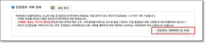 민감정보 삭제를 원할 경우에는 "민감정보 삭제화면"으로 이동하여 삭제처리를 합니다.