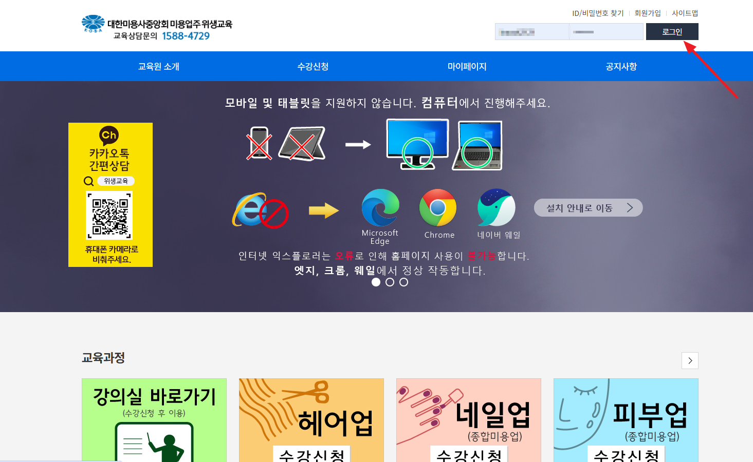 네일업과 피부업의 경우 미용업(종합) 영업자에게 수료가 인증되지만, 이용업의 경우 해당되지 않으므로 주의해야 합니다. 또한, 모바일과 태블릿은 지원되지 않으므로 컴퓨터나 노트북을 사용해야 합니다. 인터넷 익스플로러는 오류가 발생할 수 있으니 엣지, 크롬, 웨일 등의 브라우저를 이용하세요.