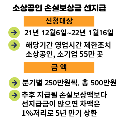2021년 12월6일부터 22년 1월16일까지 영업시간 제한을 받은 소상공인과 소기업 총 55만곳이 대상이며 21년 4분기와 22년 1분기 각 분기별로 250만원씩 해서 총 500만원의 손실보상 선지급액을 받게 됩니다. 이전에는 손실을 본 금액을 계산하여 증빙자료를 제출하고 이에 대해서 심사를 통과한 후에 손실보상금을 지급했던 것과 다르게 우선 위의 신청대상에 들어가기만 하면 500만원을 선지급합니다.